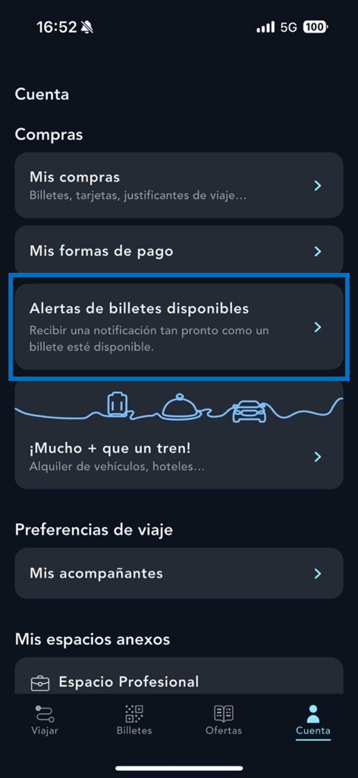 Ve a "Cuenta" y haz clic en "Alertas de billetes disponibles".